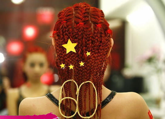 把頭發(fā)當(dāng)做旗面,再點(diǎn)綴上金黃色的五角星,下面再綴上“60”字樣的裝飾。辮子末梢自然下垂的發(fā)絲,營造出五星紅旗正在飄揚(yáng)的意境。