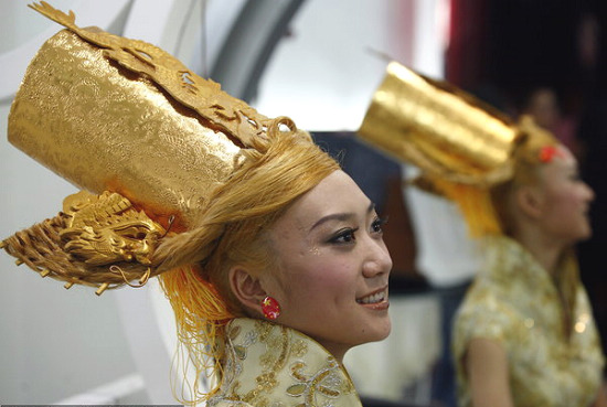 “金色代表中國(guó),巨龍盤踞在華表上,寓意著中華民族騰飛的龍馬精神!睘榱送怀鰞蓧K“祥云”,設(shè)計(jì)師將模特的頭發(fā)染成金黃,纏繞在幾根發(fā)簪上。為了增加發(fā)型的中國(guó)元素,設(shè)計(jì)師還沒忘記將一串黃色的絲線點(diǎn)綴在“祥云”下面,讓整個(gè)發(fā)型顯得非常飄逸。