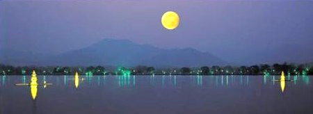 四、三潭印月 杭州西湖之美,乃世人皆知。中秋月明之夜,泛舟湖上,盡可領(lǐng)略“煙籠秋水月籠紗”的詩般意境。三潭印月是西湖三島之一,也是自古以來的賞月勝地。三個石塔,亭亭玉立在波光瀲滟的湖面上。每逢月夜,特別是中秋佳節(jié),在塔里點上燈燭,洞口蒙上薄紙,燈光從中透出,宛如一個個小月亮,倒影湖中。待到皓月中天,月光、燈光湖光交相輝映,月影、塔影、云影融成一片“一湖金水欲溶秋”。