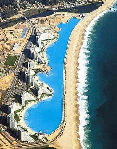 世界上最大的戶外游泳池位于智利的海濱城市阿爾加羅沃(Algarrobo)。這個(gè)人工游泳池是用附近太平洋的水來填滿的。據(jù)吉尼斯世界記錄,這個(gè)于2006年12月竣工的游泳池長3324英尺(990米),在2007年被評(píng)為世界上最大的游泳池。