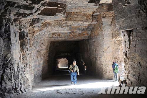 10月22日,游人從郭亮村的絕壁長(zhǎng)廊中走過。