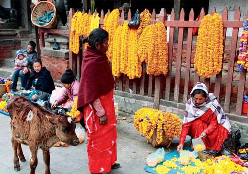小鎮(zhèn)是尼瓦爾族聚集地,雕花木窗,耕牛梯田,百年來維持著未曾大改的模樣。傳統(tǒng)居民門前總有及膝高的臺(tái)階,老人靠在木門前,盤腿坐著,瞇起眼睛看這些觀光客模樣的人來來往往;