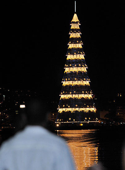 12月23日晚,在巴西里約熱內(nèi)盧羅德里古-迪弗雷塔斯湖上,巨型圣誕樹(shù)被點(diǎn)亮。新華社記者 宋為偉 攝