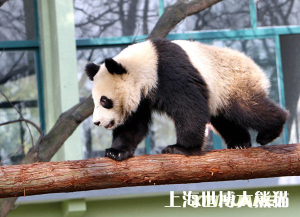 資料圖片:一只“世博大熊貓”在隔離區(qū)室外活動(dòng)場(chǎng)獨(dú)木橋上玩耍(1月15日攝)。新華社記者凡軍攝