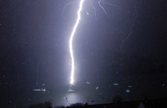 一道刺目的巨大閃電擊中了湖中一條游艇的桅桿。這張照片是由英國康沃爾郡特魯羅市的業(yè)余攝影師弗朗西斯-埃文斯所拍攝。他從自己家中的窗口恰好捕捉到這一罕見的鏡頭。強(qiáng)大的閃電精準(zhǔn)地?fù)糁辛税N乃灌従拥挠瓮В@條游艇長約18英尺(約合5.5米)。