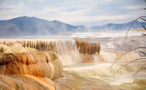 可惜的是,2002年的一次地殼變動(dòng),使得猛犸的大部分熱泉都不再流,死掉的細(xì)菌變成灰白色的粉末,殘留在乾枯了的大臺(tái)階上,反射著耀眼的陽光,將這里變成一片肅剎的不毛之地,讓我們這些2009年才來參觀的游客,頓覺可惜!這張照片是現(xiàn)存唯一一個(gè)規(guī)模稍大的活泉Pallete Spring。然而即使Pallete Spring的規(guī)模也只有原來的一小半了。