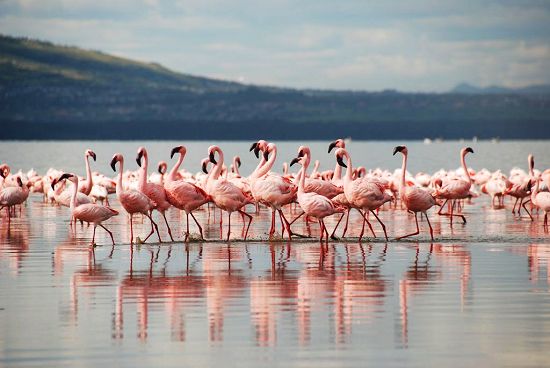 首都內(nèi)羅畢西部160公里(99英里)的肯尼亞裂谷。粉紅色的火烈鳥(niǎo)涉水渡過(guò)納庫(kù)魯湖(Lake Nakuru)。