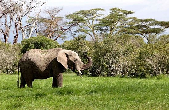 首都內(nèi)羅畢北350公里(217英里)紐納基鎮(zhèn)附近肯尼亞山坡。一頭大象在Ol Pejeta野生動物保護區(qū)吃草。
