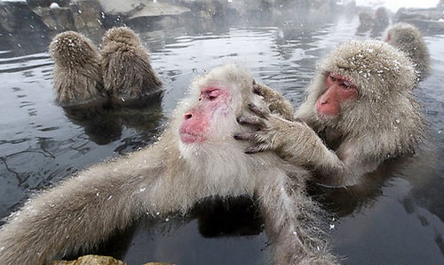 每到冬天,白雪紛飛時(shí),這些野生猴兒們就會(huì)紛紛跳進(jìn)溫泉中取暖驅(qū)寒。這些紅色面孔的雪猴身披濃密的棕色毛發(fā),攀附在巖石上并將自己浸泡在溫暖的溫泉中,打著呵欠,看起來好像特別放松。它們?cè)跍厝锘ハ嗍崂硎崂砻l(fā),幫對(duì)方抓抓虱子,相互依偎和幫助,一幅和諧美好的景象。大多數(shù)猴子喜歡在溫泉里安靜地泡著,讓溫暖的泉水為它們帶走寒冷和疲乏,也有的猴子特別好動(dòng),還不時(shí)潛入水中尋找食物。