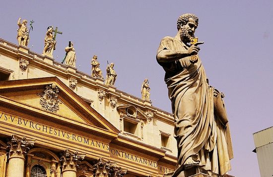 大教堂兩側(cè)有手持殉道長(zhǎng)劍的圣保羅和手持兩把鑰匙的圣彼得。圣彼得高大的雕像,他神情自若、面帶微笑,右手握著兩把耶穌送給他的鑰匙,左手拿著一卷耶穌給他的圣旨。他頭上的縷縷卷發(fā)、臉上的根根皺紋、下巴上的撮撮胡須和身上的層層長(zhǎng)袍無一不被雕琢得細(xì)膩、逼真。彼得是耶穌的12個(gè)門徒中的第一個(gè),耶穌去了天堂后把鑰匙交給了他,彼得成為了基督教的首領(lǐng),他來到羅馬傳教,后來,羅馬的皇帝為了嫁禍基督教,放火燒了羅馬城,然后歸罪于基督教,并處死了彼得。圣彼得大教堂就是為紀(jì)念彼得而修建的。