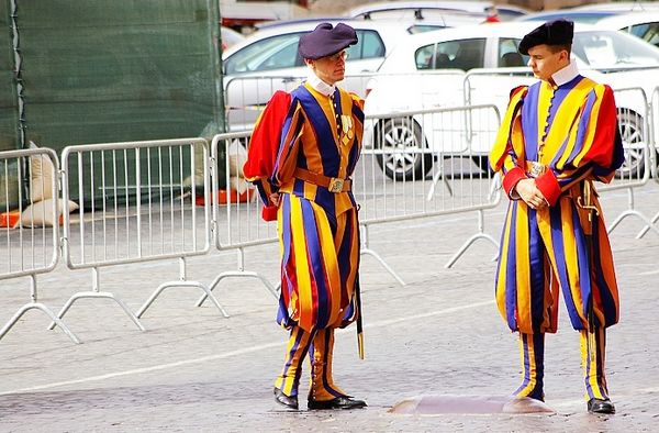 瑞士衛(wèi)隊身穿米開朗基羅設(shè)計的服裝,每年5月6日都要舉行宣誓儀式,誦念500年來一成不變的誓詞,祈求上帝保佑自己圓滿完成任務(wù),為效忠教皇可以獻出自己的生命。現(xiàn)在的衛(wèi)兵們都成了一種禮儀性的展示,還熱情地為游客引導(dǎo)。