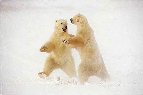 北極熊之舞:托馬斯·曼格爾森在加拿大哈德遜灣拍攝的。那里的丘吉爾角是世界上北極熊的最大聚居地,這些孤獨(dú)的北極熊聚到一起,等待氣溫下降,河水結(jié)冰。當(dāng)冬天的暴風(fēng)雪來臨時(shí),兩只成年北極熊在測試對方的力量,這樣做不僅讓它們保持健壯,還可以確定群體內(nèi)的等級地位。