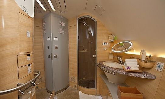 寬大的空間可供頭等艙內(nèi)安排私人套間,甚至包括淋浴設(shè)施的浴室。