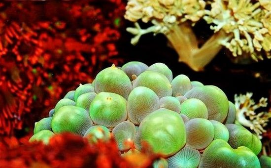 氣泡珊瑚很漂亮,不動(dòng)的水都會(huì)出現(xiàn)很多氣泡,氣泡珊瑚的名就是這么來(lái)的。它們膨脹和擴(kuò)張都需要光,白天張開(kāi)時(shí),看起來(lái)很像氣泡、珍珠或葡萄。泄氣時(shí)可以看見(jiàn)它們有一個(gè)硬的骨架。