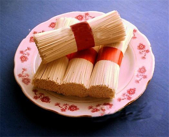 潢川貢面:因潢川史稱光州,所以歷史上稱“光州貢面”。此面系清油兌水鹽合細(xì)面粉,經(jīng)過拌、揉、發(fā)酵、盤條、上架、拉扯、涼曬、截切等十多道工序制成。潢川貢面具有條如銀絲,色白如蓮,硬而空心,曲而不斷,久而不變,易于保管,隨吃隨拿,用而方便等特點(diǎn)。潢川貢面以精粉和芝麻香油為主料,下適量食鹽、明礬等佐料,面揉合均勻后上架拉制,制成后的貢面條細(xì)如絲,光澤如銀,清馨襲人。貢面的絕妙之處是每根貢面雖細(xì),但皆為空心,呈細(xì)管狀,工藝之精巧令人贊嘆不已。若以雞湯煮面,輔以其他佐料,滑潤(rùn)爽口,鮮美無比。