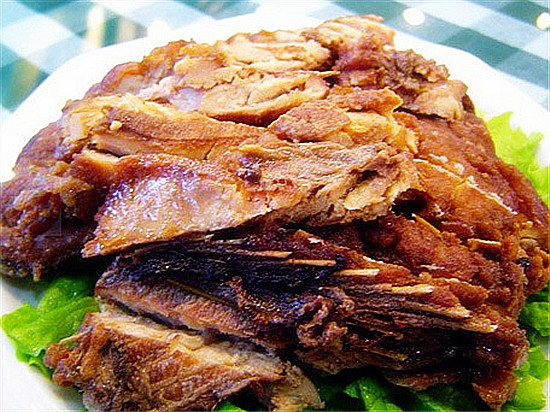 蹄花絲:蹄花絲是河南民間的一種名菜,歷史悠久,用材獨(dú)具匠心,將豬蹄、腿煮熟剔去骨頭,用刀切碎,放入五香粉,精鹽攪拌勻稱,分三、四斤一堆,用稀布包裹緊,壓以重物,置一夜后去包布,使利刀片切,再豎切成絲,用時(shí)調(diào)以醬油、醋、蔥(或蒜苗)絲和勻,鮮醇郁香,回味無(wú)窮。