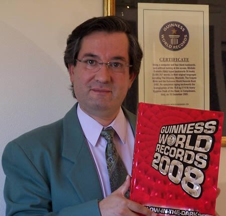 一臺(tái)電腦,4個(gè)鍵盤(pán),永遠(yuǎn)不看屏幕,意大利人米歇爾·桑蒂利亞倒打字寫(xiě)下67本書(shū),用的都是書(shū)的初始語(yǔ)言,包括《奧德賽》《麥克白》《圣經(jīng)》《吉尼斯世界紀(jì)錄大全》及古希伯來(lái)語(yǔ)版《死海古卷》。2008年11月16日,他又用相同方式完成多部伊特魯里亞語(yǔ)書(shū)稿和一本中文書(shū)籍。