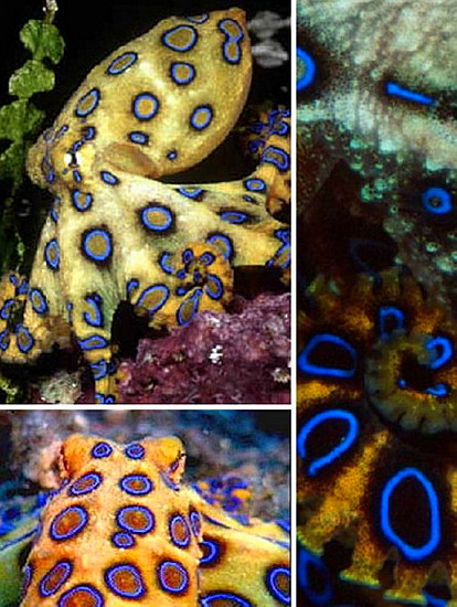 這種章魚奇特而致命。藍(lán)環(huán)章魚將“致使誘惑”帶到了一個(gè)全新的高度。這種小而羞澀的章魚生活在太平洋海岸水域,它們有著致命毒液,并用毒液麻痹小魚和蝦等常見獵物。和很多烏賊和章魚一樣,藍(lán)環(huán)章魚皮膚中有光合細(xì)菌載色體,當(dāng)這種動(dòng)物受到驚嚇或者興奮時(shí),載色體會(huì)變得更加明顯,你最好不要惹它們!