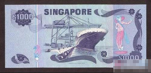 1978年的新加坡最大面額鈔票,正面下方有馬來文、華文、泰米爾、英文四種文字加注國(guó)名,還蓋了一個(gè)紅色的中文印章,其它的地方就都是用英語寫的了。背面有類似福建的惠安女造型的女性,可能在說明新加坡華人大多來自中國(guó)南方的福建省吧!