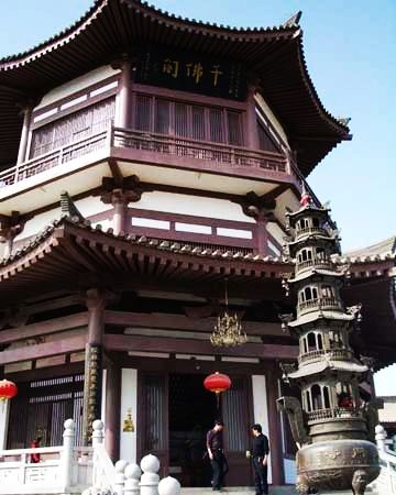 千佛閣位于武陟縣城內(nèi)南大街北端,建于明嘉靖三十六年(1557年),青咸豐元年(1856年)重修。三檐歇山頂回廊式建筑,面闊五間,進(jìn)深五間,東西長17.4米,南北寬15.7米,綠色玻璃瓦覆頂。上層檐下斗拱為七踩三昂,明間補間鋪作兩攢,此間斜拱斜昂拱一攢,側(cè)面為土攢,昂嘴刻三浮云,轉(zhuǎn)角斗拱中間昂嘴透雕龍首。大額枋正面有雕花三組。上層閣內(nèi)頂部巴磚上繪有天干地支、陰陽五行、八卦太極圖等。千佛閣建筑高大,氣勢雄偉,雕工精湛,閣頂繪圖反映了明清時期佛道合流的情況。 1986年11月,公布為河南省文物保護(hù)單位。