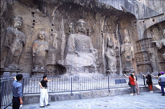 龍門(mén)石窟中另一個(gè)著名洞窟是賓陽(yáng)洞。這個(gè)窟前后用了24年才完成,是開(kāi)鑿時(shí)間最長(zhǎng)的一個(gè)洞窟。洞內(nèi)有11尊大佛像。主像釋迦牟尼像,高鼻大眼、體態(tài)端祥,是北魏中期石雕藝術(shù)的杰作。