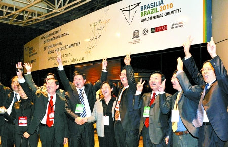 在巴西利亞,河南代表團(tuán)慶祝登封“天地之中”歷史建筑群申遺成功