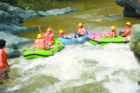 雪花谷漂流長約8公里的路程,落差高達110米之多,相當于從一座百余米的山頂俯沖直下,讓每個經(jīng)歷的人都直呼刺激過癮,充分感受懸空瀑落的緊張刺激。而驚險之余,卻也有不少緩流淺灘,讓大家舒緩心情,與愛人蜜語交流,沿河兩岸還有不知名的開得正艷的野花,大膽的勇士還可以采來送給心愛的人,作為愛的見證物!