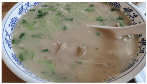 丈地羊肉湯屬熗鍋羊肉湯,以肉鮮湯濃味香而著稱。通過選取本地優(yōu)質(zhì)小山羊肉,土灶火大鐵鍋熬湯,以牛油、羊油爆炒羊肉,加高湯大火煮開,撒入由30多味中草藥配制成的“密料兒”,入碗后酌情加蔥花香菜即成。成品比一般羊肉湯要濃,口感醇厚雋永,回味悠長。一些湯客為了喝碗丈地羊肉湯,驅(qū)車幾十公里而來。