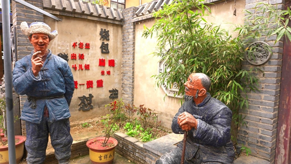 在原味鄉(xiāng)村區(qū),記者走進一家農(nóng)耕文化博物館,木锨、扁擔、織布機、草屋、石磨等應有盡有。走在文化街區(qū)上,還能遇到不少中原特色的生活街景。其中,一處“噴空”主題街景雕塑吸引了大家的目光。一個老農(nóng)拄著拐杖坐在路邊;另個一農(nóng)民戴著火車頭帽站在旁邊與之噴空,臉上堆滿了樸實的笑容。旁邊刷白的墻上,寫著“燒包”“不老蓋”“楚喘”等河南方言,充滿了中原文化特色。