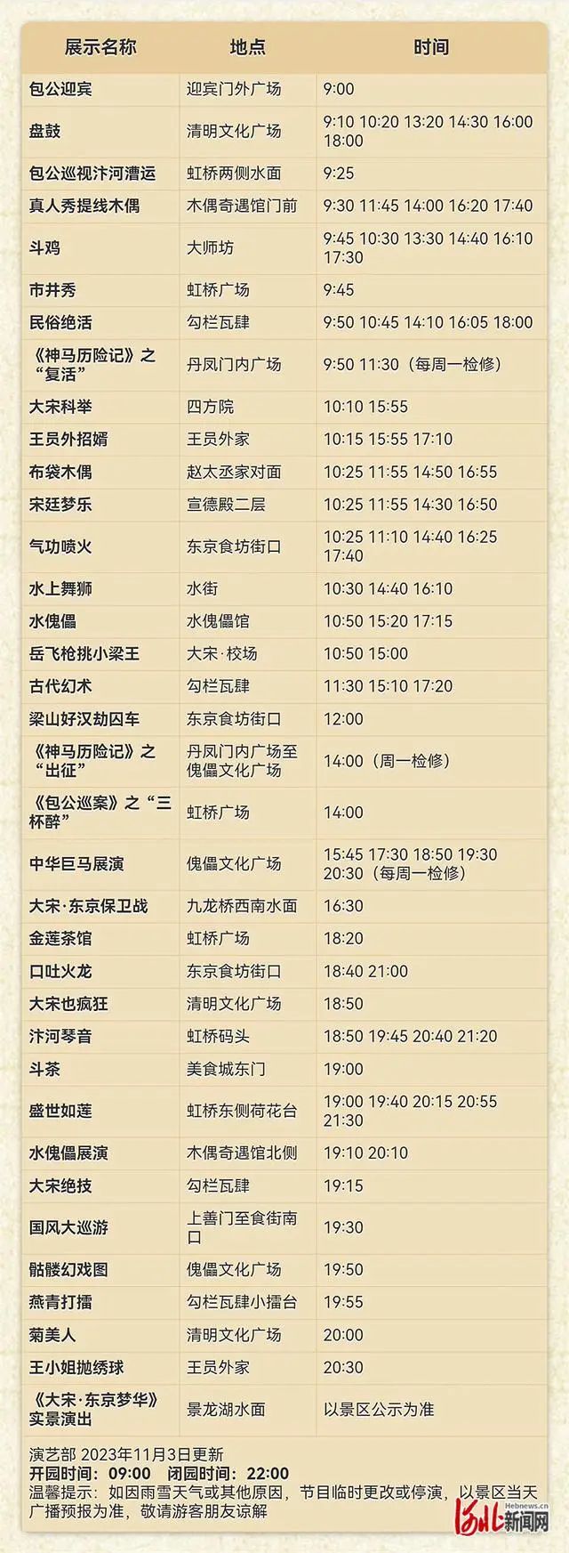 盤鼓(清明文化廣場(chǎng))→真人秀提線木偶(木偶奇遇館門前)→《神馬歷險(xiǎn)記》之“出征”(丹鳳門內(nèi)廣場(chǎng)至傀儡文化廣場(chǎng))→《包公巡案》之“三杯醉”(虹橋廣場(chǎng))→岳飛槍挑小梁王(校場(chǎng))→大宋•東京保衛(wèi)戰(zhàn)(九龍橋西南水面)→金蓮茶館(虹橋廣場(chǎng))→汴河琴音(虹橋碼頭)→斗茶(美食城東門)→中華巨馬展演(傀儡文化廣場(chǎng))→大宋絕技(勾欄瓦肆)→國風(fēng)大巡游(上善門至食街南口)→燕青打擂(勾欄瓦肆小擂臺(tái))→菊美人(清明文化廣場(chǎng))→王小姐拋繡球(王員外家)→《大宋•東京夢(mèng)華》實(shí)景演出(景龍湖水面)