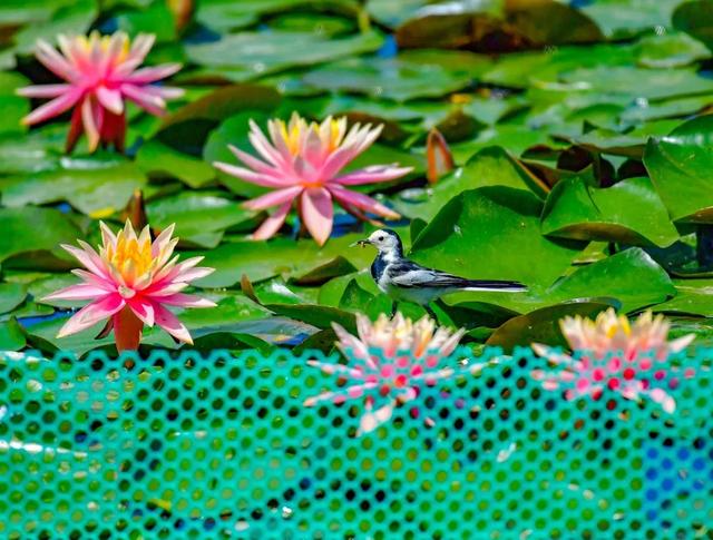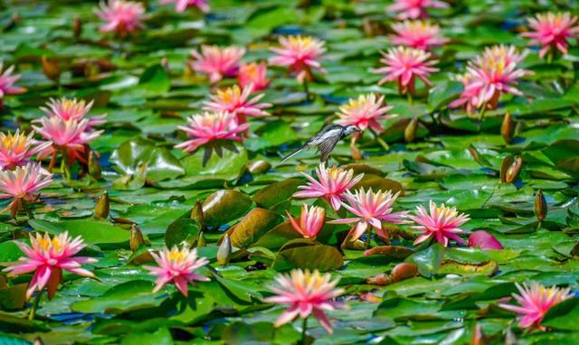 睡蓮也吸引了不少小動物前來親近。蜻蜓在睡蓮前穿梭飛翔,偶爾停留在花瓣上稍作歇息;小魚在蓮葉下嬉戲,時不時躍出水面,濺起片片水花。