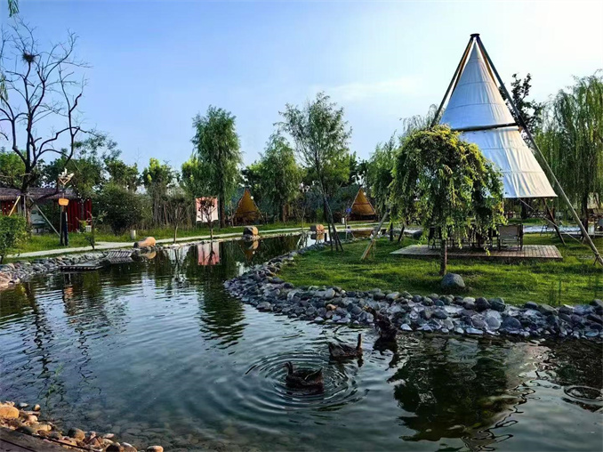 位于南四環(huán)與凱旋路交叉口西邊,院內有一條小溪環(huán)繞,假山、秋千、潺潺流水,營造出世外桃源的景象。院內還配置了形色各異的帳篷,不同種類的兒童無動力設施,可以觀賞綠色植被,體驗農田耕種,了解農耕文化。莊內配備有各種美食烤肉燉鍋,在這里可以度過一個休閑美好的周末。