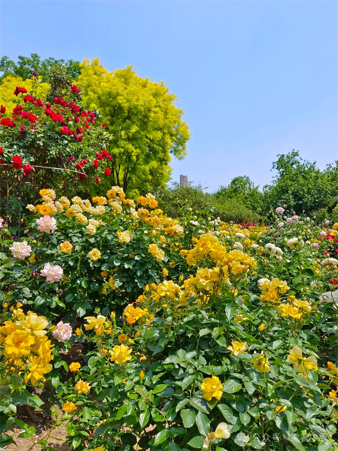 地鐵 5 號(hào)線月季公園站 C 口直達(dá)月季公園。4 月底至 5 月,公園里的月季爭(zhēng)奇斗艷,各種顏色的月季花競(jìng)相開放,紅的似火,粉的如霞,黃的賽金。傍晚時(shí)分,夕陽的余暉灑在月季花上,“月季映晚霞” 的奇景令人陶醉,仿佛置身于一幅美麗的畫卷之中。