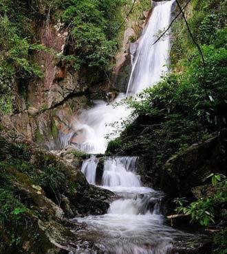 金竹瀑布群位于樂安縣金竹鄉(xiāng)畬族聚居地的嚇通村境內(nèi),距離縣城72公里。該山山勢(shì)雄峻,古木參天,山泉甘冽,綠意盎然,自然形成形態(tài)各式各樣的大小瀑布的總落差,高達(dá)400多米。其瀑布之多,總落差之大,在全國(guó)都屬罕見。其中,氣勢(shì)磅礴、飛珠濺玉、形態(tài)奇異、特色鮮明的瀑布計(jì)有狗腦瀑、點(diǎn)光潭、雙龍?zhí)兜龋鋲衙罋鈩?shì)令人嘆為觀止。有專家贊嘆說(shuō):“廬山三疊素以落差為美,黃果樹瀑布以面積寬為美,而嚇通瀑布兩者兼而有之。”