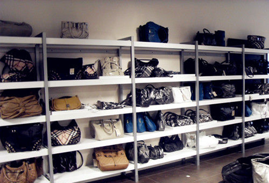 Burberry工廠店其實就是一個大倉庫,除了門口有結帳柜臺,走進去堆得滿坑滿谷的都是各式Burberry產品,有鞋子、風衣、襯衫、褲子、套裝、polo衫、T-shirt、襪子、皮帶、雨傘,各種樣式大大小小的包包,圍巾、絲巾、領帶,甚至還有枕頭、茶、餅干!