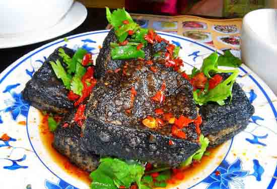 長沙的臭豆腐要數(shù)百年老店火宮殿最有名,進(jìn)火宮殿的人沒有不吃臭豆腐的。1958年,毛澤東到長沙視察時,還專門到火宮殿吃了一頓臭豆腐。火宮殿的臭豆腐是用優(yōu)質(zhì)瀏陽豆豉加冬筍、香菇、曲酒等煮制的鹵水點(diǎn)成的,炸好的臭豆腐外脆里嫩,再澆上辣椒油、香油、醬油等調(diào)料,非常好吃。
