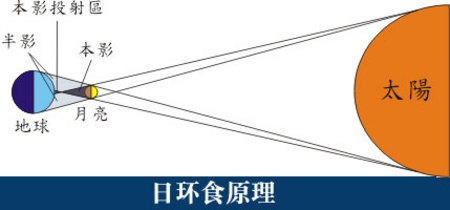 日環(huán)食的時(shí)候,月球的距離離地球較遠(yuǎn),所以本影的焦點(diǎn)到達(dá)不了地球,就是不能把太陽全部遮住,叫日環(huán)食。