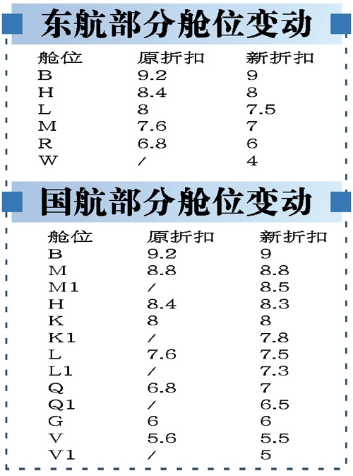 東航:B艙9.2折變9折;“H艙”從8.4折調(diào)回8折;國航:微調(diào)9個子艙位票價;新增5個子艙位;川航:T艙原來是9.2折,現(xiàn)在變成“9.2折或9折”