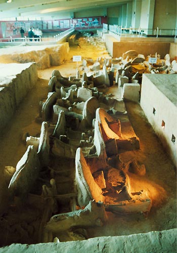 二十世紀(jì)50 年代,在古老的黃河岸邊,塵封地下。幾前年的虢國(guó)墓地被人們第一次發(fā)現(xiàn)了,在其后的發(fā)掘中,人們發(fā)現(xiàn)雜草叢生,亂石堆積的荒野之下竟然埋藏著一支蓄勢(shì)待發(fā)的底下車馬軍陣,這支規(guī)模恢弘,氣勢(shì)威武由真車真馬組成的軍陣就這樣默默守衛(wèi)他們的主人,年復(fù)一年潛藏地下3000個(gè)春夏秋冬。這支軍陣由三座陪葬車馬坑組成。虢國(guó)國(guó)君虢季的陪葬車馬坑,位三座車馬坑的中間,南北長(zhǎng)47.6米共清理戰(zhàn)車13輛戰(zhàn)馬64匹,13輛戰(zhàn)車全部集中在坑的北半部,64匹戰(zhàn)馬則大部分?jǐn)[放在坑的南半部,每輛車下分別都?jí)河袘?zhàn)馬,馬是最先埋入坑中的,在清理時(shí)專家發(fā)現(xiàn),馬的前腿或后腿常常并列在一起,因而推斷馬是被捆綁殺死后埋入坑中的,埋葬順序是將馬全部入葬,再?gòu)目又胁肯虮币来畏胖脩?zhàn)車,前一輛車 壓在后一輛車前轅之上,轅頭均朝北排列有序。其中最北端第一輛車下葬有四匹馬,周禮天子駕六,諸侯駕四,這一特點(diǎn)說(shuō)明虢國(guó)國(guó)君嚴(yán)格遵守,周代的禮制。