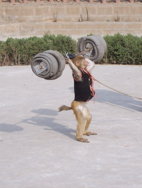 景區(qū)內(nèi)免費(fèi)的猴子表演——舉重冠軍!記憶中看猴戲是很久很久以前的事情了,耍猴人拿個破鑼猛敲,我們小孩就尋著鑼聲跑上前去,看的津津有味。那時侯特別痛恨耍猴人的鞭子,特別可憐小猴子。