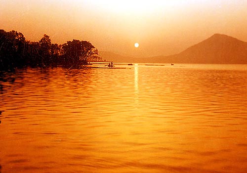 然后,直奔上次圍繞三匝而未登岸,遍尋猴跡而不得的猴島。大圣的子孫們在這里約八九十只,猴王與猴妃在那里相互逮虱子,三名猴保鏢與一群小猴子環(huán)繞其周圍。一群少年猴子則在不遠(yuǎn)處的林間樹上攀緣嬉戲,蕩來蕩去。五六只老少猴們則總是尾隨不去,希望能從我們手中得到撂去的花生。一只扛著大肚子的母猴則坐在那里安詳不動(dòng)。猴們在適宜它們的地方繁衍生息,自得其樂。不知它們到?jīng)]到過外面的世界?它們中,不知會(huì)不會(huì)再出現(xiàn)一只扎筏出去訪道學(xué)藝、改變命運(yùn)的孫悟空?