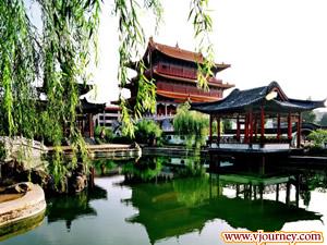 位于市中心的春秋樓氣勢不凡,創(chuàng)建于元代,95年修復(fù)的關(guān)圣殿,面闊七間,進(jìn)深三間,高30米,三重樓檐,頂飾黃色玻璃瓦,漢白玉砌的欄板,青石鋪的地;朝陽下奕奕生輝,莊重古樸,內(nèi)塑關(guān)羽座像高13米,真是少見。園內(nèi)還有春秋樓,刀印樓,問安亭,甘糜二后宮,掛印封金堂等園林建筑。此樓是后人為昭彰關(guān)羽忠義,建樓紀(jì)念。