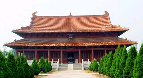 全院坐北朝南,南寬北窄呈梯形,共有四進(jìn)院落,占地面約5000余平方米,建筑面積1600余平方米。在建筑上,既有鮮明的民族建筑風(fēng)格,又頗具道家特色,采取了四合院對(duì)稱軸式的建筑格局。前院有靈宮殿(原為山門(mén)),1988年修復(fù)后為兩層硬山前后廊式,面闊三間,東西有配殿。院內(nèi)東側(cè)為十方堂,現(xiàn)十方堂北次間辟為門(mén)洞,其東為山門(mén)。西側(cè)為云水堂。正北為關(guān)帝殿,歇山式,青瓦頂,正脊素立面,兩端有鴟吻,垂脊有跑獸,面闊三間,進(jìn)深三間,臺(tái)基石造,須彌座式,前后踏垛三級(jí)。殿內(nèi)木雕暖閣中塑關(guān)羽象,左有關(guān)平,右有周倉(cāng)。