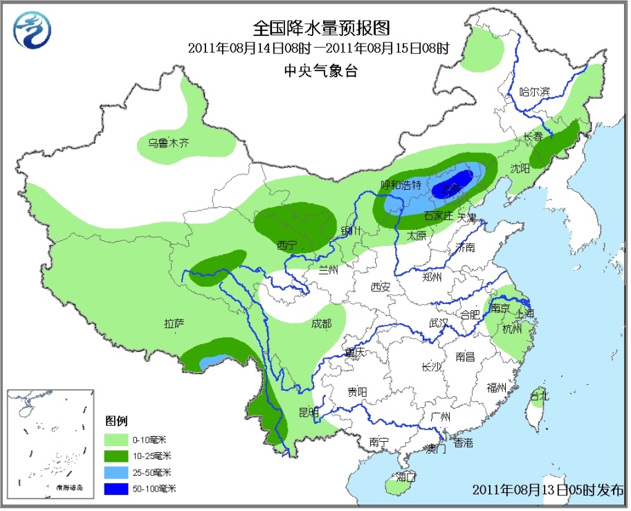 14日08時至15日08時,甘肅中部、內(nèi)蒙古中部偏南地區(qū)、華北北部、吉林東部、西藏東南部、云南西部等地的部分地區(qū)有中到大雨,其中,華北東北部的部分地區(qū)有暴雨;上述部分地區(qū)并伴有短時雷雨大風(fēng)或冰雹等強(qiáng)對流天氣。