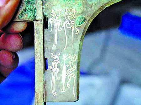 古墓內(nèi)發(fā)現(xiàn)的青銅戈上雕刻有精美鳥書。
