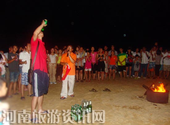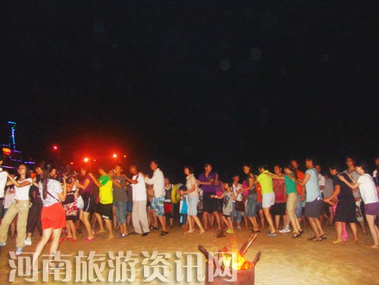 夜幕降臨,歡樂繼續(xù),海灘上早已燃起熊熊的篝火。遠(yuǎn)處濤聲陣陣,近前火光搖擺。會(huì)員們圍著波浪一樣起伏的火焰,伴著的微咸的海風(fēng),暢飲啤酒、歡歌起舞、盡情狂歡……