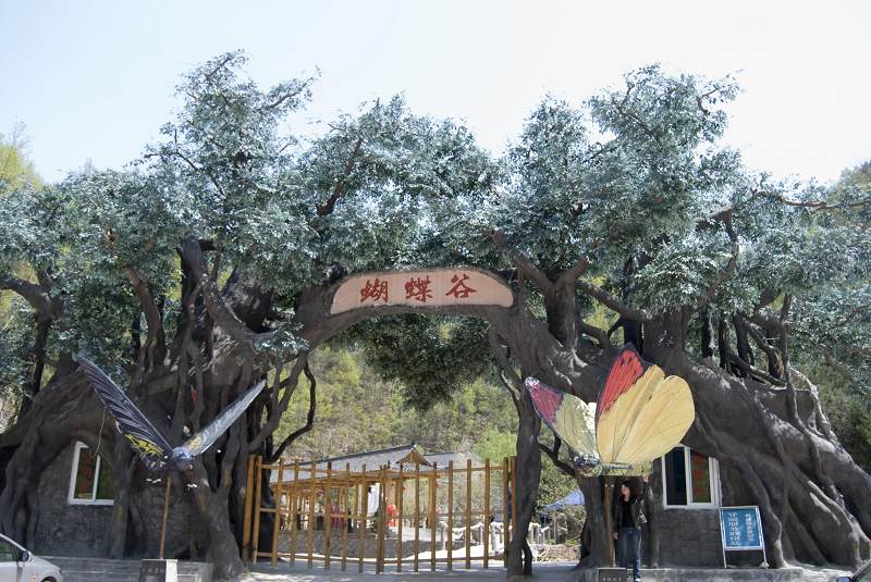 蝶谷位于欒川縣城1.5公里的鼎室山腳下,西臨雞冠洞、東臨老君山。兩側(cè)環(huán)山,中間谷底貫穿一條溪流,谷內(nèi)小橋流水、景色怡人、自然生長著成千上萬只蝴蝶,隨處可見色彩斑斕的蝴蝶在谷間翩翩起舞,在這里你可以感受到大自然的無窮魅力。峽谷內(nèi)總面積15平方公里,有385種野生物種,野藤、野果形成綠色長廊,滿山野花 競相斗艷, 進入峽谷,漫天蝴蝶在谷中起舞,情景令人心曠神怡,一些蝴蝶密密匝匝依附在枝葉、灌木叢中、飛瀑流泉之上與自然融為一體,受到游人的干擾后,象炸開了鍋般五顏六色漫天飛舞,幾秒種又聚在一起,因此游人留下:“蝶谷游人多好奇,以物擊之散又聚”的絕妙詩句。谷內(nèi)陳列了多種蝴蝶文化商品,以滿足游人的購物需求。