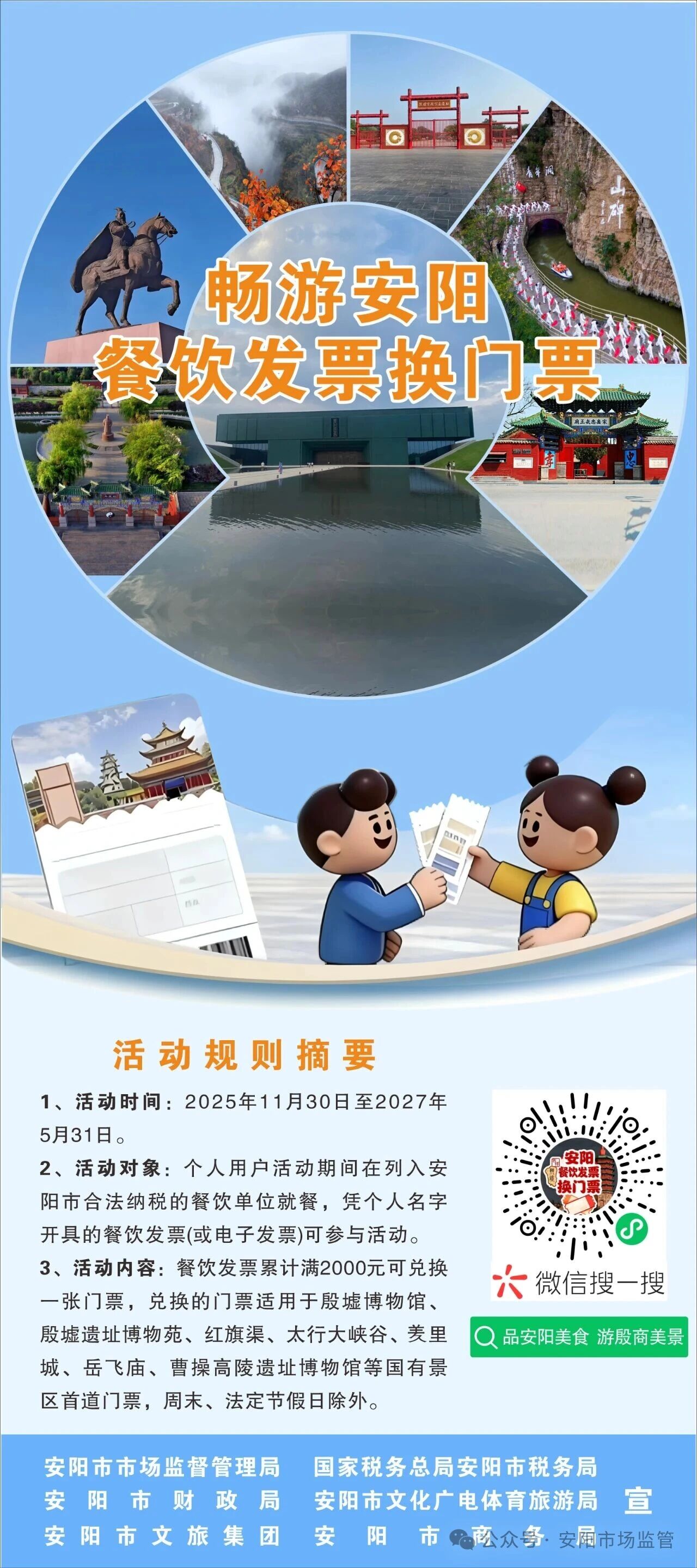 2025年12月2日,安陽市“發(fā)票暢游樂享安陽”餐飲發(fā)票換門票活動(dòng)啟動(dòng)儀式成功舉辦,各相關(guān)單位、重點(diǎn)餐飲企業(yè)、國(guó)有景區(qū)及市民代表齊聚一堂,共同見證這一惠及民生、助力產(chǎn)業(yè)的創(chuàng)新舉措落地,此次活動(dòng)以“以票促治、以游惠民”為核心,旨在通過餐飲與文旅的深度聯(lián)動(dòng),實(shí)現(xiàn)讓利于民、規(guī)范行業(yè)、促進(jìn)融合三大目標(biāo)。