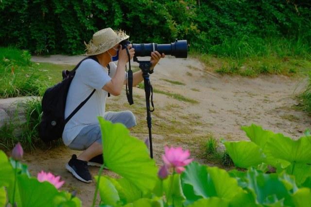 荷花塘中,亭亭玉立的荷花千姿百態(tài),分外妖嬈,在綠意盎然的荷葉映襯下,構成了一幅夏日清涼畫卷。園中不少游人駐足賞花“打卡”,攝影愛好者更是架起“長槍短炮”。市民王先生告訴記者,為了欣賞荷花,6點就來到了紫荊山公園,“荷花出淤泥而不染,在驕陽下盛開,這樣的品質(zhì)值得贊美。”