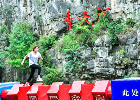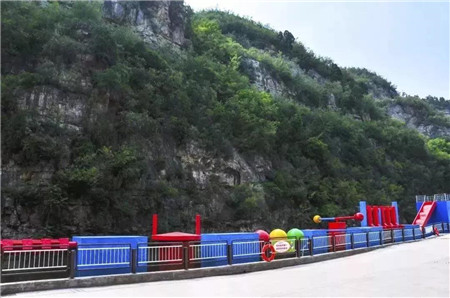 青天河快樂大沖關,全長65米,寬13米,共有六道關卡,賽道建在青天河天井關優(yōu)質的泉水之上。